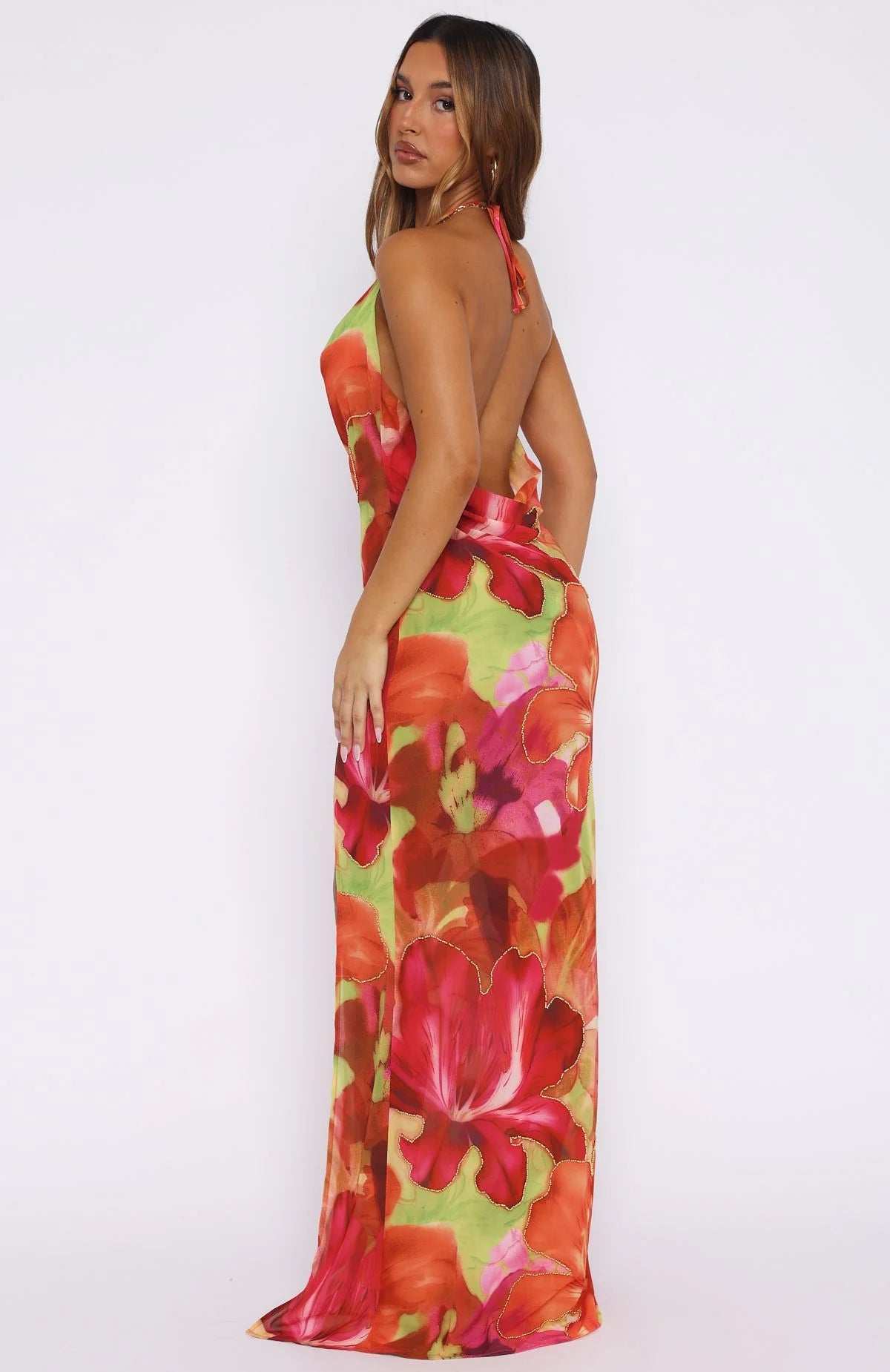 Golden hour glow, outfit to match. The Falling Into You Maxi Dress Tropical Bloom features a halter neck style with back self tie closure, low cowl neckline, maxi length with high side split, backless with cowl detailing, invisible zipper and clasp closure, and beaded detailing. Complete the look with sandals and statement jewellery for a fit we love.