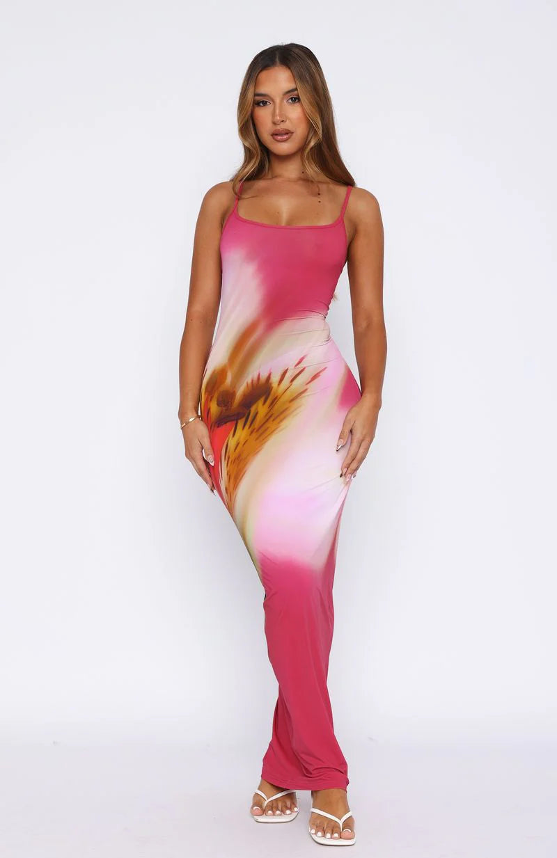 You'll look out of this world in the Feeling The Heat Maxi Dress in Berry Blossom. This maxi dress features thin, adjustable straps, low neckline and stretch fabric. We love this paired with clear mules and gold accessories for an on-trend look!