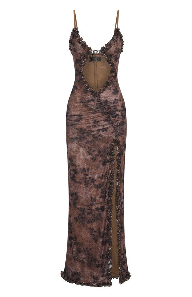 Raise temperatures and make hearts skip a beat in the High Voltage Maxi Dress Mahogany Leaffall! Features thin adjustable straps, front cut out with adjustable tie detailing, high front slit, stretch material for an easy slip on design and lined, slightly sheer material. Style cowboy boots and layered accessories for a look we adore!
