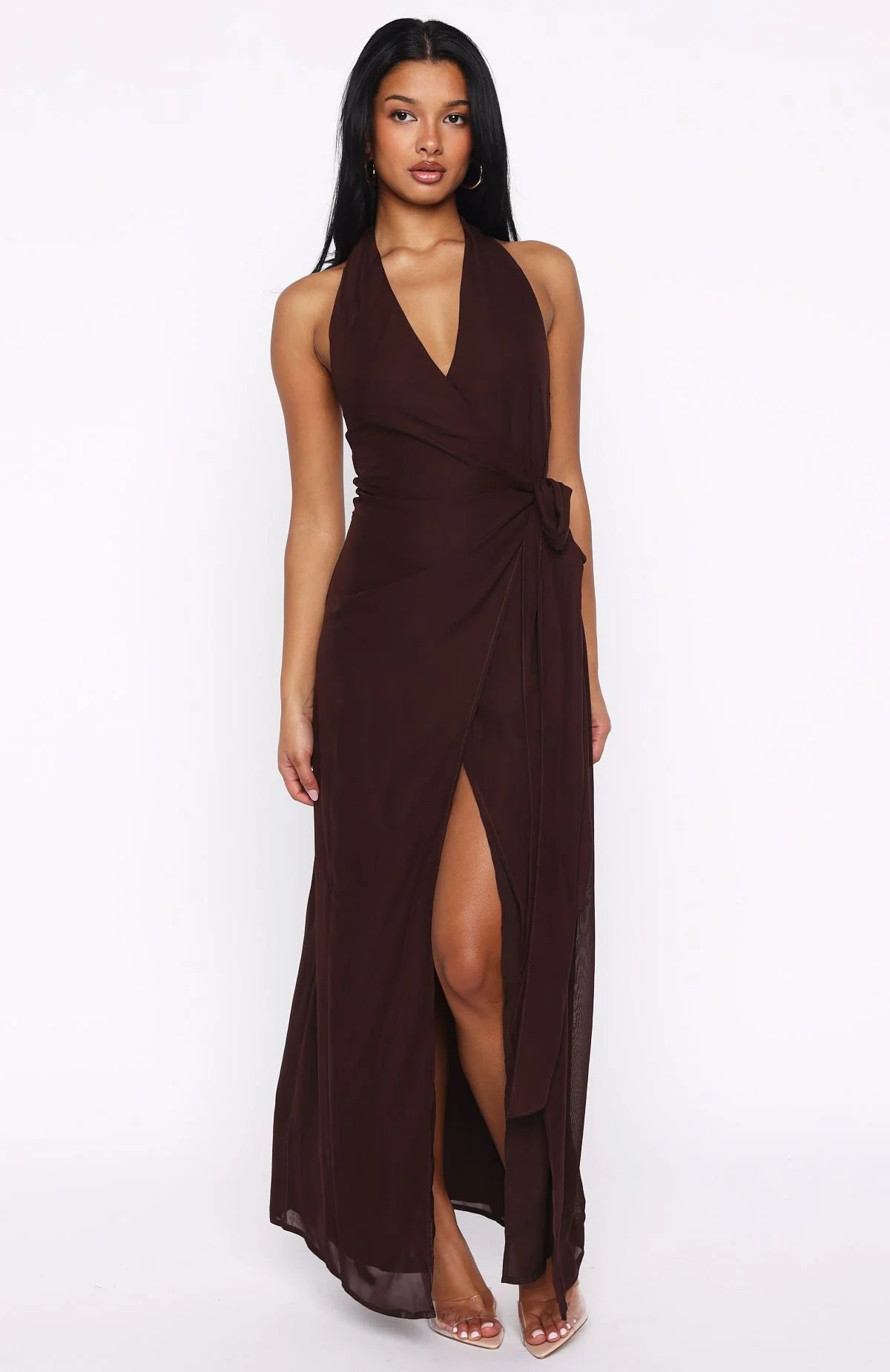 Sunset dinners just got a glow up in the How I Feel Halter Maxi Dress in Chocolate. With self‑tie halter straps and a plunging neckline, this beauty cinches at the waist with draped fabric that ties into a chic bow. A sultry side leg split and backless cut add drama, while the full lining ensures comfort for every move. Style with heels and layered gold jewellery for a eye catching fit.