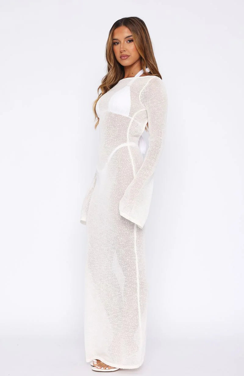 The Malta Mermaids Long Sleeve Maxi Dress White is here to make you glow! Featuring long sleeves, a high cut neckline, backless, maxi length, unlined, slightly sheer and stretch material for an easy slip on design. This maxi is best paired over a white bikini for the perfect poolside look!