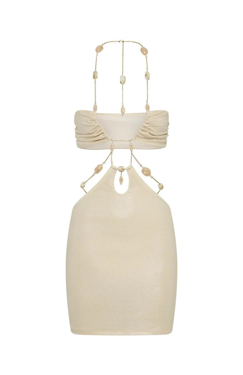 It's viral for a reason! Meet the Moonlit Muse Mini Dress in Pearl! This mini length silhouette features a chain halter neckline adorned with chunky beadwork which can be worn straight or crossed at the front. Designed with integrated grip tape at bust, and purposeful cut-out at the waist framed with coordinating chains and beads. Crafted from a high‑stretch, lined fabric, it's elegantly backless. Finish the look by making those heels speak and let your layered jewels do the talking.
