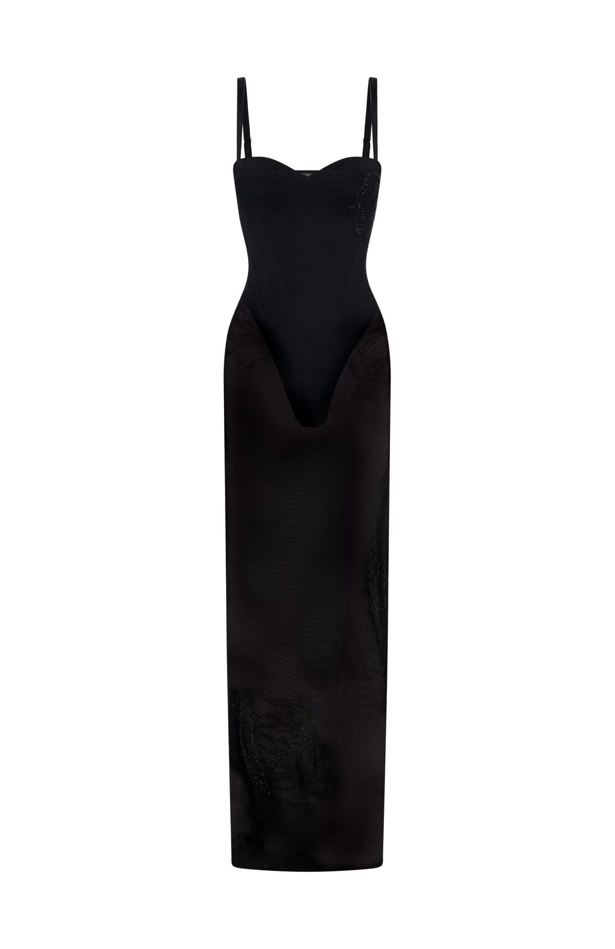 Say "Bonsoir" to elegance with the Parisian Night Maxi Dress in Black. This enchanting piece features adjustable, thin elastic shoulder straps and a flattering sweetheart neckline with underbust wire support. The fully lined bodysuit includes a convenient hook-and-eye closure at the crotch for ease. A sheer overlay adorned with sparkling rhinestone floral embellishments adds a touch of glamour, while the sultry back split ensures movement and allure. Style with simple heels and jewellery to let the dress do all the taking.