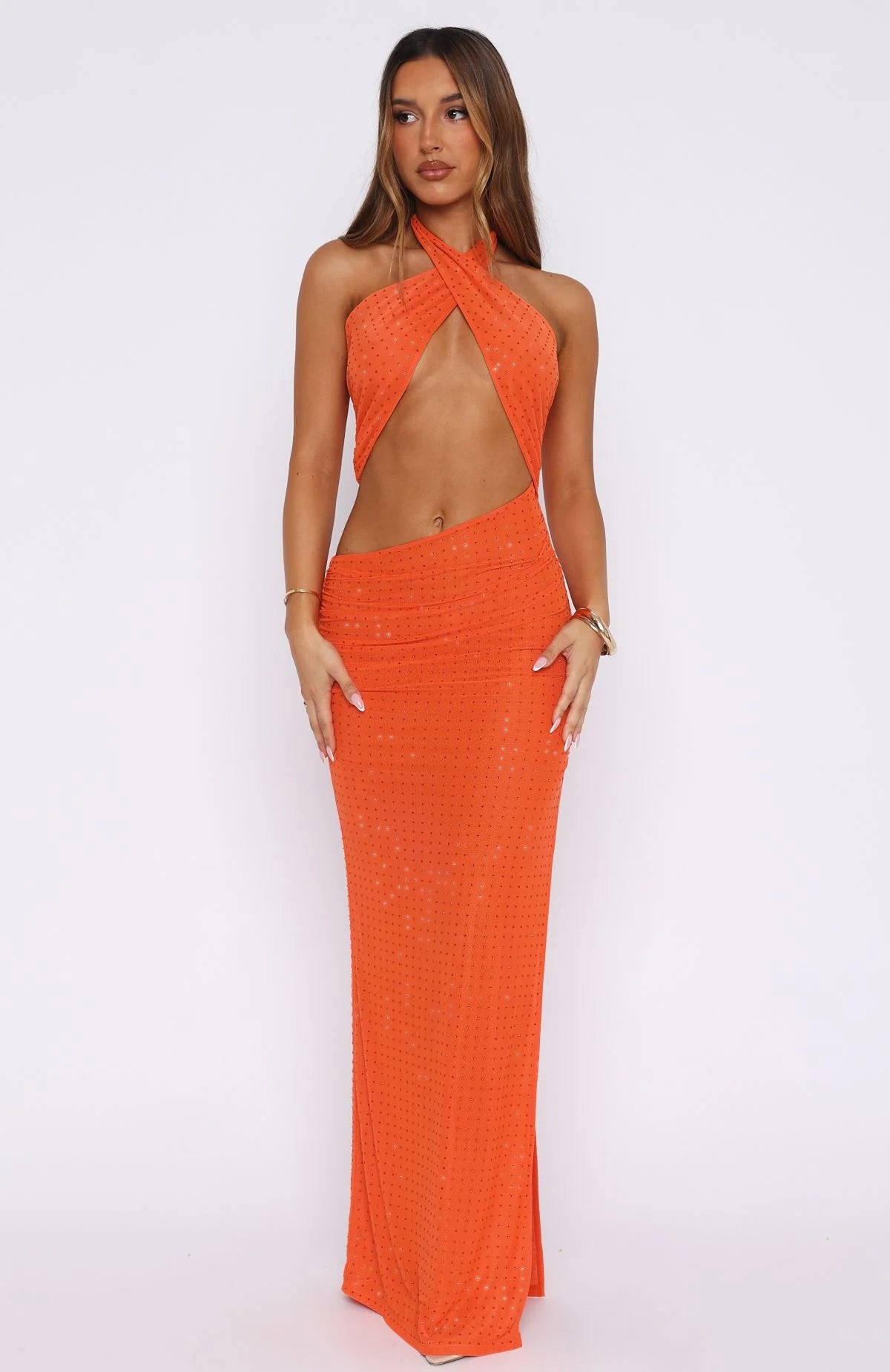 Make a statement in The One Halter Maxi Dress in Orange! Features self tie halter straps, criss cross design over bust, cut out design over waist, asymmetrical skirt waistline, lined and high cut side split giving a glimpse of leg. Feel your best by pairing with heels and gold jewellery.