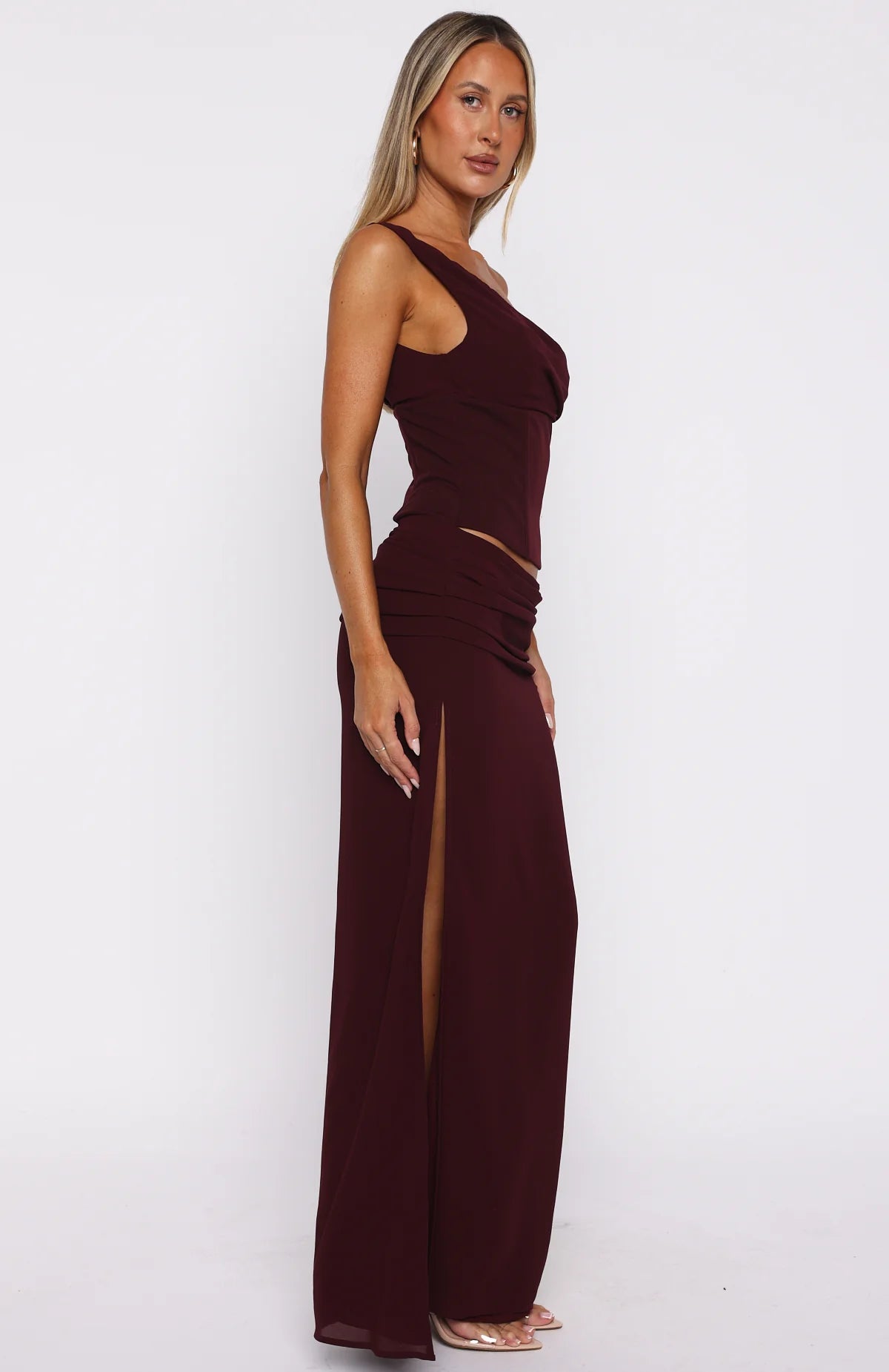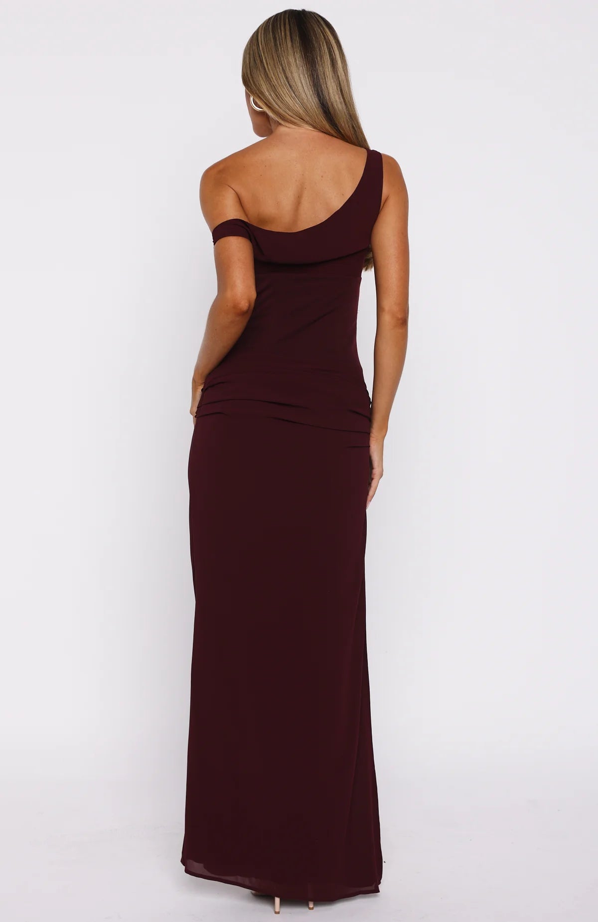 A bold take on feminine elegance, the Unavailable Energy Maxi Dress in Burgundy is designed to captivate. Features a one-shoulder neckline complemented by built-in bust cups and internal boning at waist. A cut-out at the waist adds a touch of allure, while side ruching and a high leg split enhance its sultry appeal. The fully lined silhouette and the invisible side zipper ensures comfort. Pair with your tallest heels and dainty gold jewellery to complete this statement-making fit.